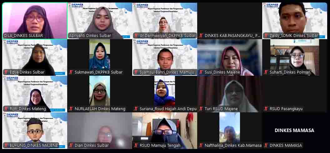 Rapat yang dilaksanakan melalui Zoom Meeting ini menghadirkan Kepala Bidang Pelayanan Kesehatan Lanjutan, Farmasi, Alat Kesehatan dan SDM Kesehatan, dr. Darmawiyah, bersama Ketua Tim Kerja SDMK, Zaldy Al Qadry, sebagai narasumber. Kegiatan ini diikuti tenaga kesehatan pemangku jabatan fungsional, pengelola program, serta unsur kepegawaian dari fasilitas pelayanan kesehatan dan Dinas Kesehatan kabupaten se-Sulawesi Barat.