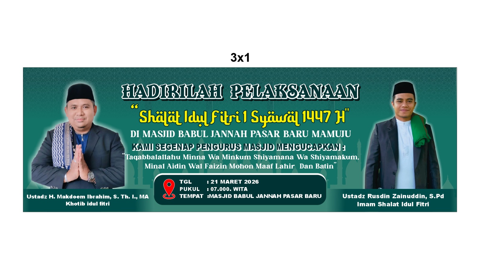 Pengurus masjid mengajak seluruh jamaah untuk hadir lebih awal agar pelaksanaan shalat dapat dimulai tepat waktu serta menjaga ketertiban selama kegiatan berlangsung. Momentum Idul Fitri diharapkan menjadi sarana mempererat ukhuwah Islamiyah dan memperkuat kebersamaan di tengah masyarakat.
