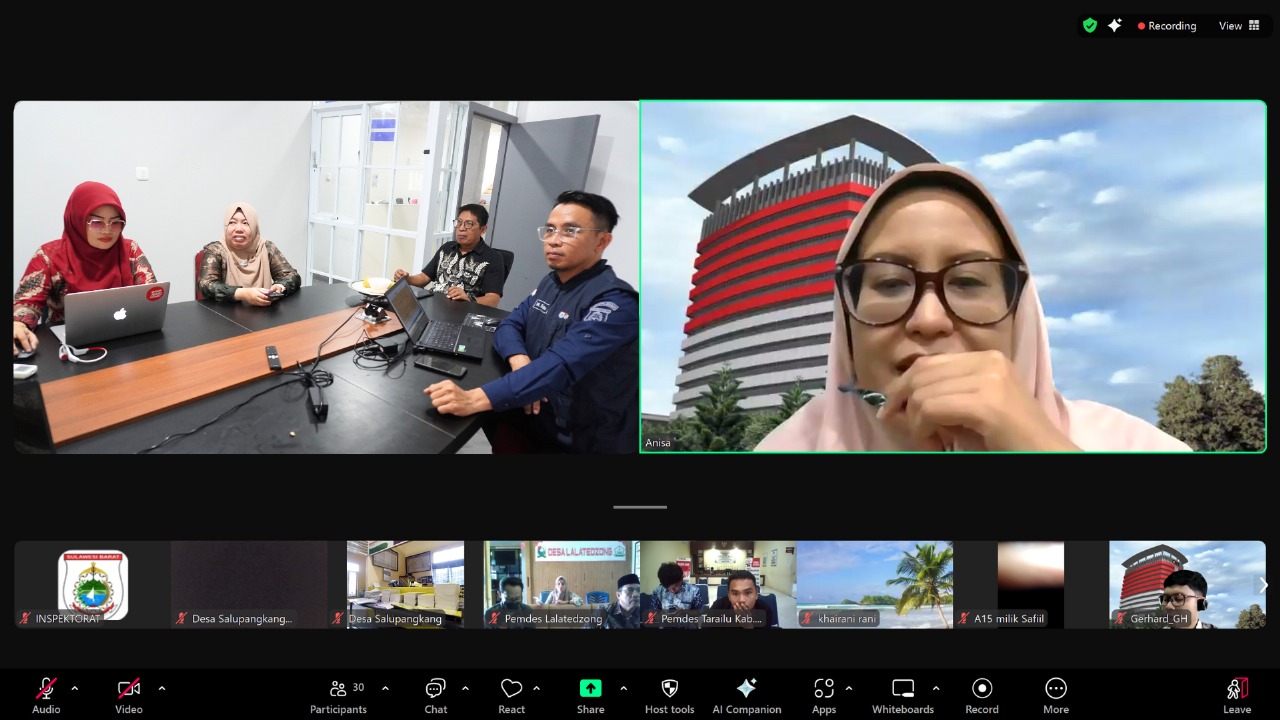 Mamuju, – Dalam rangka optimalisasi ketepatan dan kualitas pemenuhan evidance indikator Desa Antikorupsi pada lima komponen penilaian, Tim Perluasan Percontohan Desa Antikorupsi Provinsi Sulawesi Barat menyelenggarakan Rapat Validasi Indikator Desa Antikorupsi Batch #3 secara daring melalui Zoom Meeting, Kamis 28 Agustus 2025.